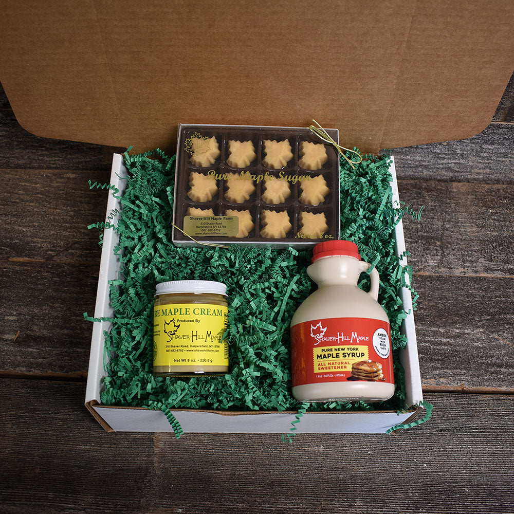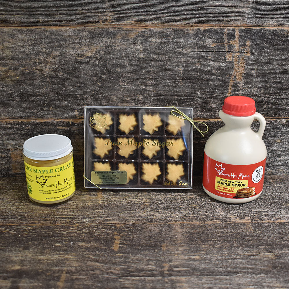 Give the essence of maple in three perfect forms. Pour the 1-pint pure maple syrup over pancakes or into recipes, spread the silky maple cream on toast and pastries, and savor the classic maple sugar candy that melts on the tongue. Elegant, delicious, and always appreciated—ideal for holidays, host gifts, and thank-yous.
